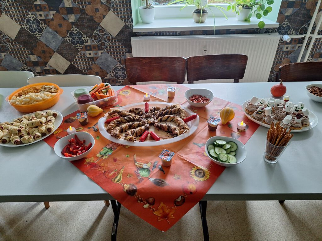 Unsere Herbstferien fanden ganz unter dem Motto Halloween – in der Storchenschule Cammin spukt es! statt. Den Anfang machte unsere Gruselwerkstatt mit dem Herstellen von Skelettbildern & Mumienpuppen. Es folgte das Unterwelt-Bowling (Warnemünde) und die Hexenküche mit schaurig-schönen Gerichten (Gräberpudding, Mumienpizzen bzw. Monstertoasts). Im Anschluss folgte die Suche nach dem geheimnisvollen Schatz von Geister-Hausmeister Gustav und dem alten Prof. Dr. Wiesenkamp. Den Abschluss, gleichzeitig unser Highlight der Woche, bildete unsere Halloweenparty mit der Gespensterbahn, der Modenschau, Gespensterspielen und dem Hexenbuffet.