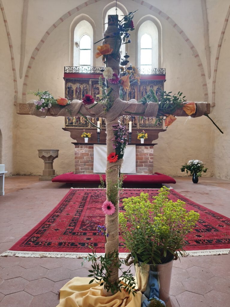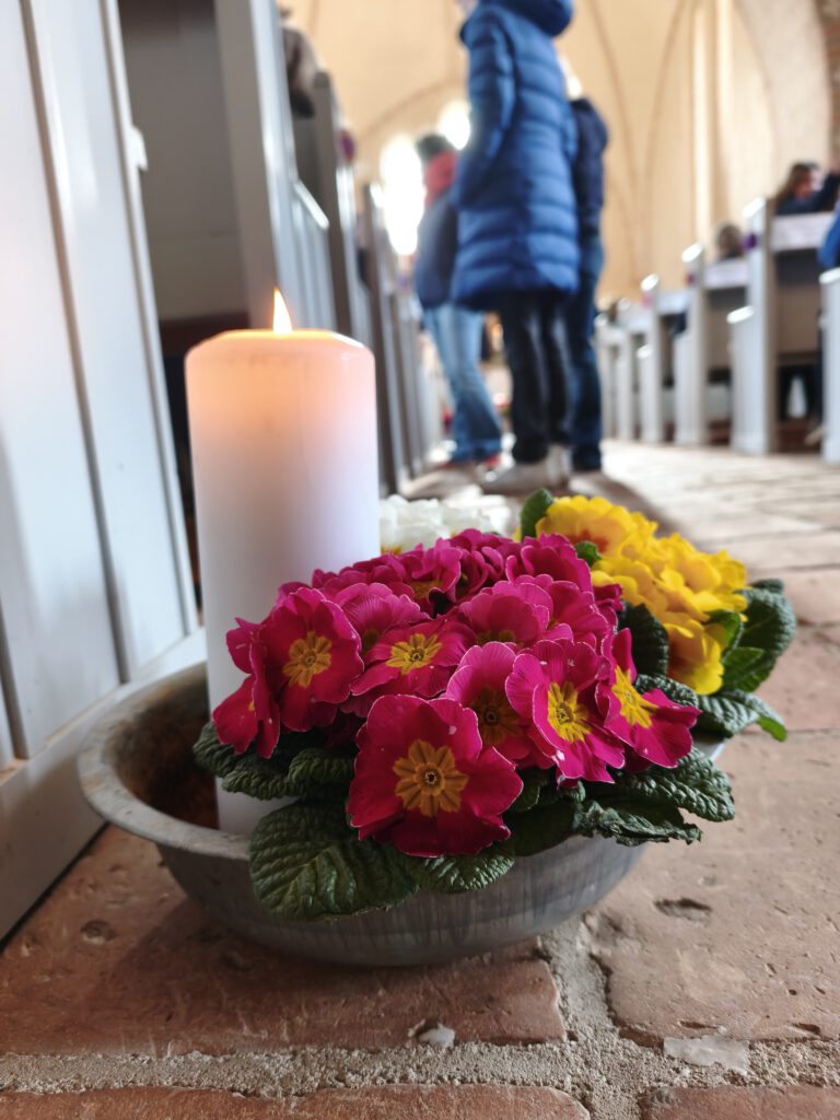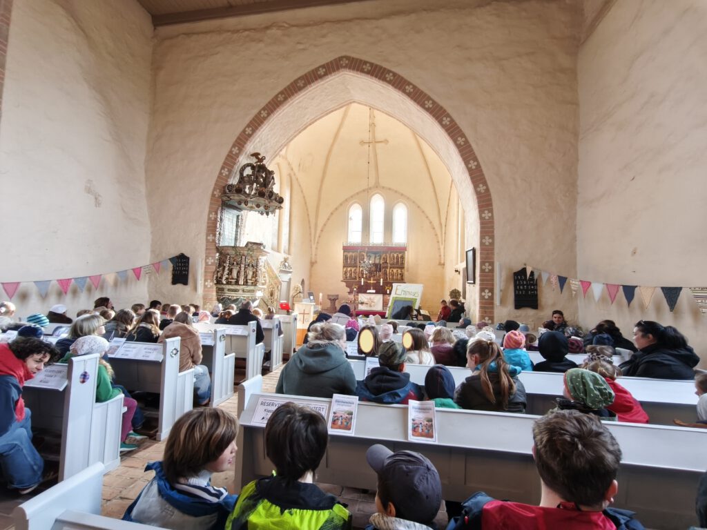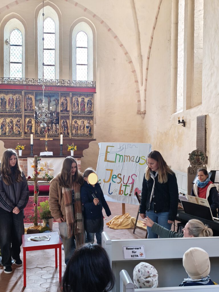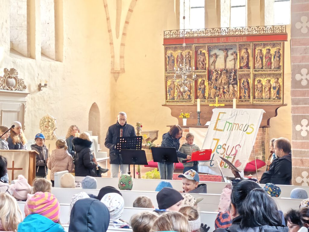 Im diesjährigen Ostergottesdienst der Storchenschule erzählen die Schülerinnern der 2. und 6. Klasse die Geschichte der Emmaus-Jünger, die nach der Kreuzigung dem Auferstandenen begegnen, ihn erkennen und wieder neuen Lebensmut nach tiefer Trauer fassen. Jesus lebt! Die Freude über diese Botschaft ist nicht nur bei den Jüngern spürbar, sondern auch in der Camminer Kirche. Fröhliche Osterlieder sind zu hören – begleitet von Frau Bludau auf der Geige, Herrn Bahr am Klavier und der Orgel, aber auch den Flöten unter der Leitung von Frau Brosig. Klasse 4 begeistert alle Anwesenden mit ihrem Osterhasentanz und bringt die ganze Kirche zum Hüpfen. Und die Frühlingsblumen am Kreuz erblühen in leuchtenden Farben.