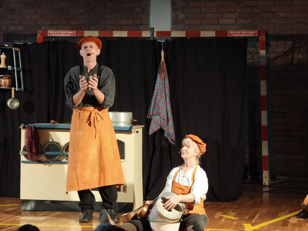 Das Musiktheater Cammin verzauberte in der Adventszeit wieder einmal die Kinder der Storchenschule, die gemeinsam mit der Kita Spatzenhausen die kreative und humorvolle Aufführung Dornröschen – aus der Schlossküche erzählt in unserer Turnhalle besuchten.