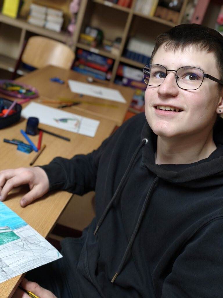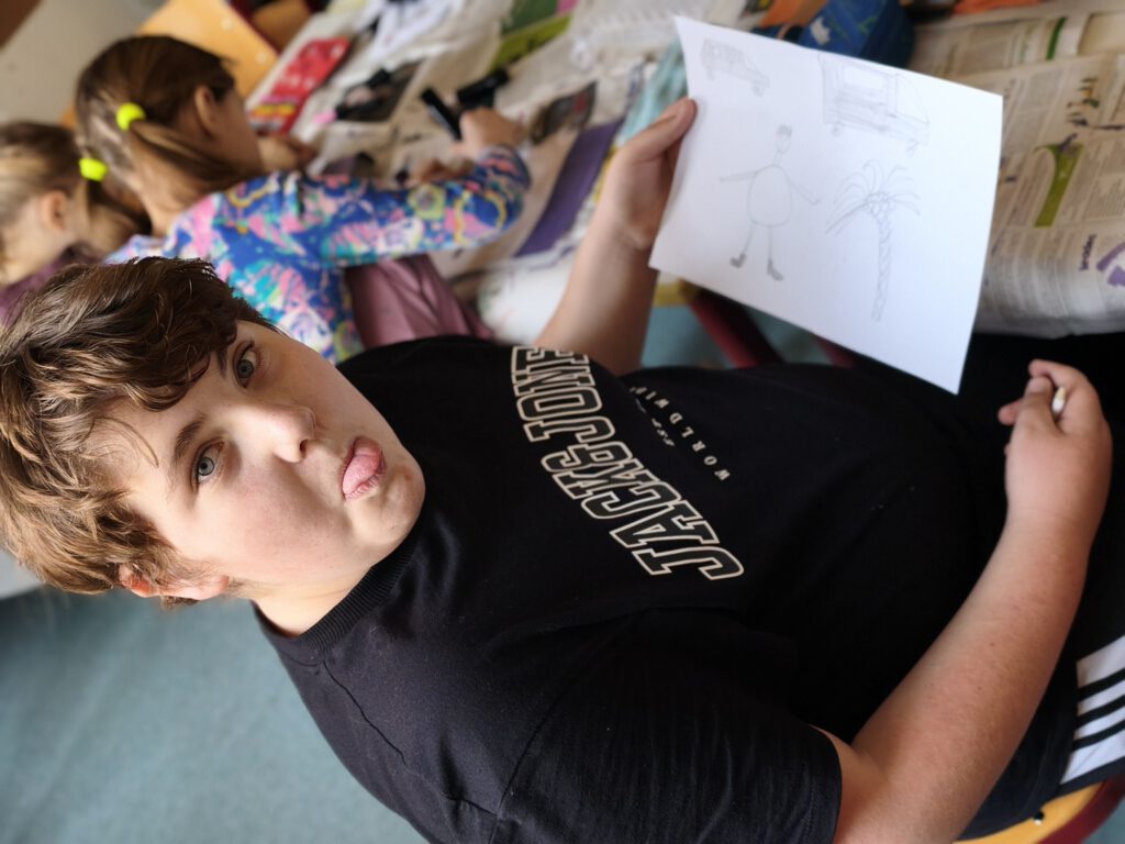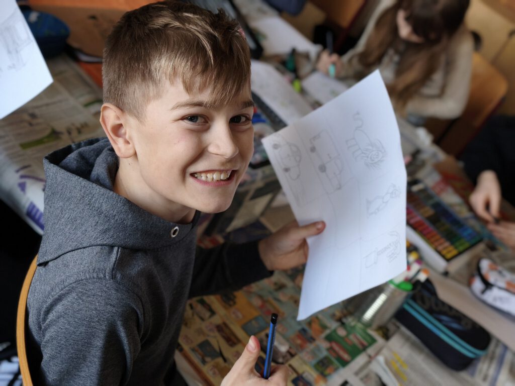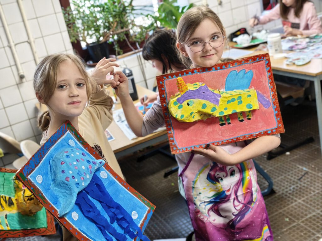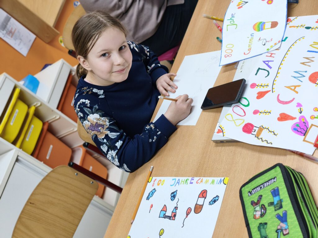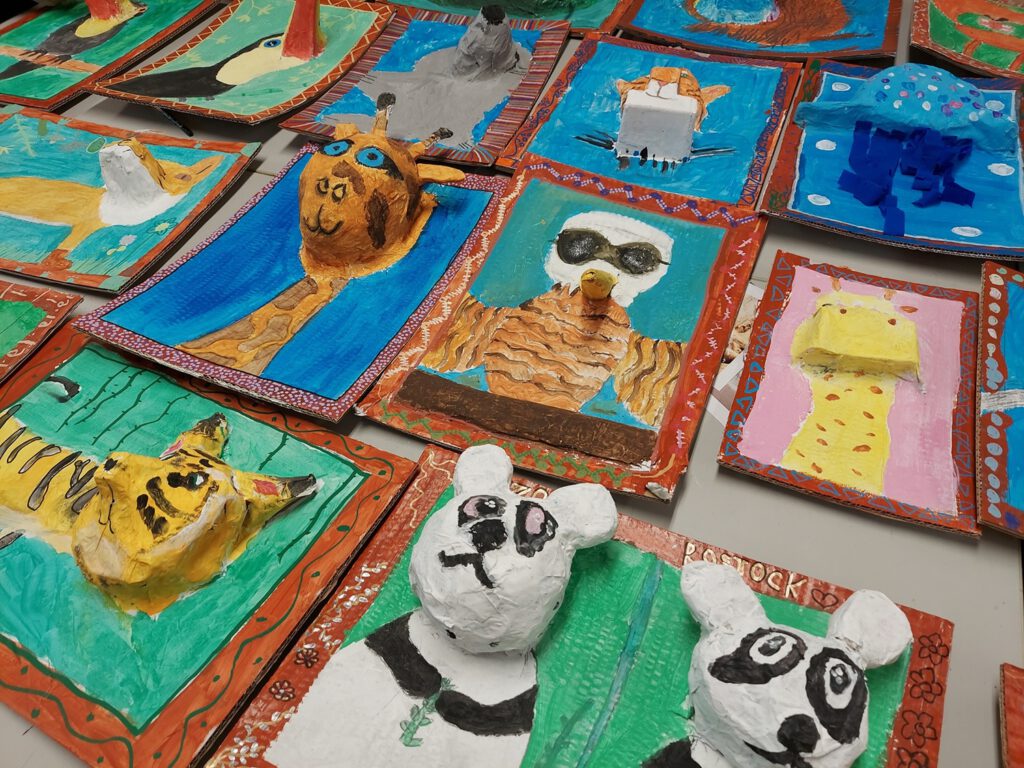 Im Street Art-Workshop ging es darum, diese moderne Kunstform zu entdecken und selbst eigene Schriftzüge und Botschaften zu malen – und möglicherweise wurde das ein oder andere Werk auch wie im echten urbanen Raum versteckt im Schulgebäude angebracht. Fingerspitzengefühl war dagegen im nächsten Klassenraum gefragt – hier wurden filigrane Tonfiguren hergestellt. Vom kleinen Spielwürfel über Schmuckschalen bis hin zu Tieren war der Fantasie keine Grenzen gesetzt. Die war auch im Tiercollagen-Kurs wichtig – aus langen Schnipseln entwickelten sich über die Tage wunderbar anmutige Tiergesichter, die durch ihr realistisches Erscheinungsbild beeindruckten. In der Vormittagssonne saßen zur gleichen Zeit die Teilnehmenden des Kurses 800 Jahre Cammin – Wir malen unser Dorf. Einige studierten intensiv die Schulansicht und brachten sie aufs Papier, andere waren im Dorf unterwegs und bildeten die Kirche, den Kindergarten oder Landschaften ab. Genauso vertieft ging es bei den Sketchnotes zu – und die Antwort auf die Frage, was die Kinder mit ihrer Schule verbinden, wurde in kleinen Skizzen und Doodles gezeichnet oder mit kunstvollem Handlettering zum Ausdruck gebracht. Mit ihrem Leben und ihrer Zukunft befassten sich die Kinder im gleichnamigen Kurs und entwickelten ein Lapbook sowie kleinere Plastiken aus Alltagsgegenständen, die ihre Vorstellungen eines späteren Lebens abbildeten. Beim Malwettbewerb für den Rostocker Zoo entstanden sogar dreidimensionale Tierbilder, die mit Pappmaché wie zum Leben erweckt wirkten.