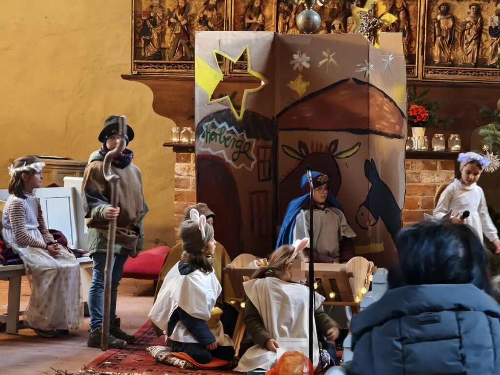 Im Anschluss erzählen die Glaubensdetektive in einem Krippenspiel die Geschichte von der Geburt Jesu. Nicht nur Maria und Josef, die von der Botschaft des Engels überrascht werden, und die aus dem Schlaf gerissenen Hirten kommen zu Wort, sondern auch der treue Esel, der Maria seine Hilfe anbietet, und die von der strahlenden Heiligkeit in tiefer Nacht irritierten Schafe. Mit der geglückten Flucht der heiligen Familie nach Ägypten vor dem Schreckensherrscher Herodes kann nun auch mit schallenden Stimmen und Orgelklängen „Oh du fröhliche“ gesungen werden.