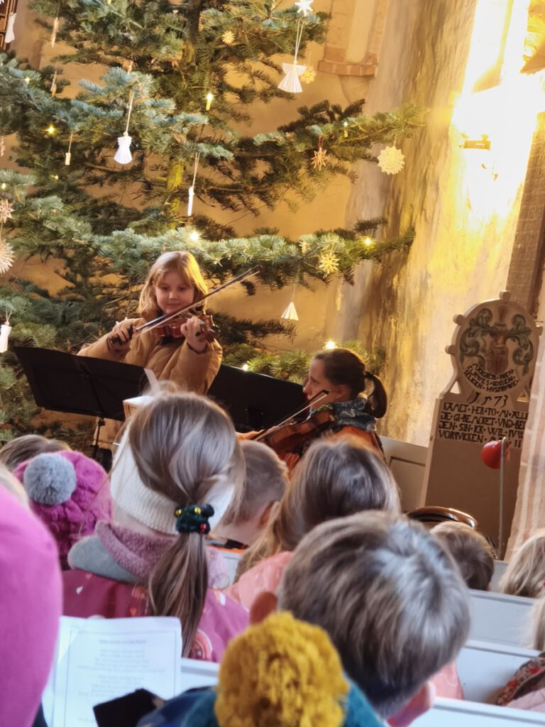 Die Freude über das Fest der Liebe ist darüberhinaus auch im schwungvollen Vorspiel von Yuki Wacker aus Klasse 5 auf der Geige sowie der Flötengruppe unter der Leitung von Elisabeth Brosig zu hören. Sie werden mit großem Applaus bedacht und leiten damit in den festlichen Orgelabschluss von Herrn Bahr über.