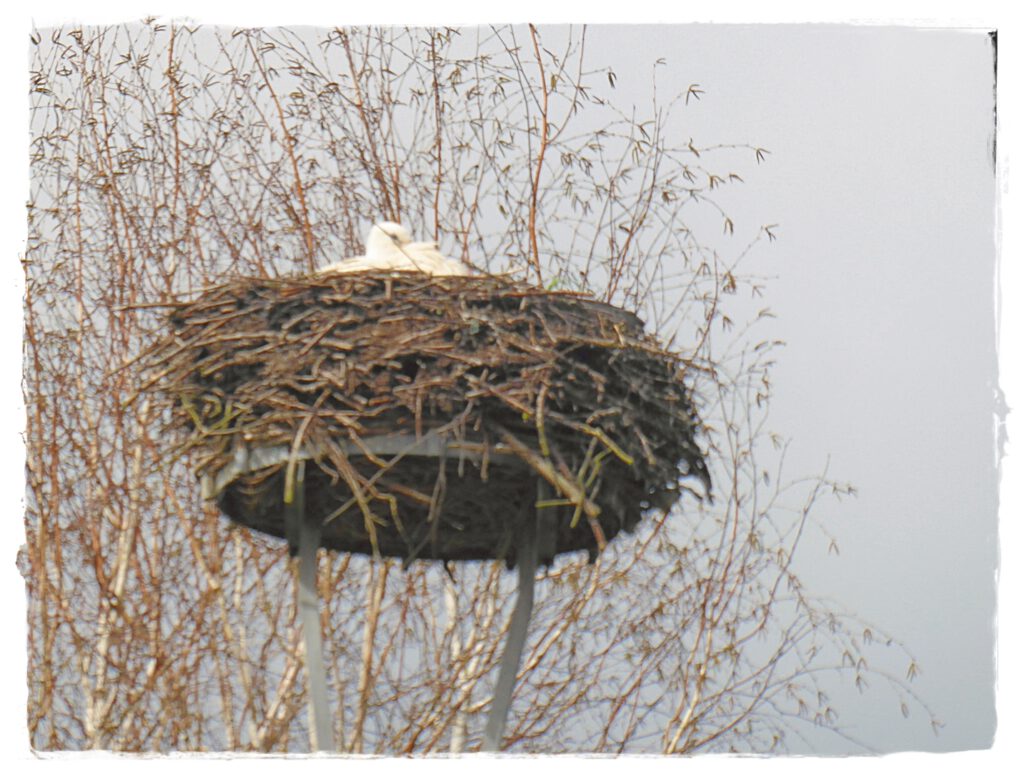„dass (mindestens) zwei Jungstörche im Nest heranwachsen. Sie sind in etwa 14 Tage alt und werden in diesem noch sehr jungen Alter stets von einem der Altvögel bewacht. Gestern stand die unberingte Störchin bei den Küken mit im Nest.“
