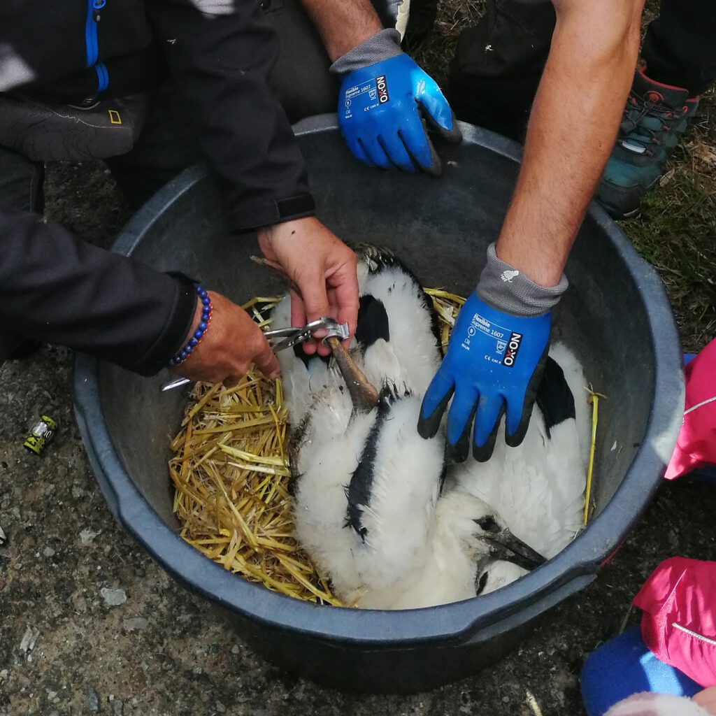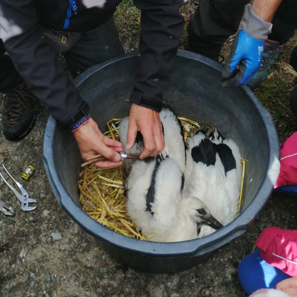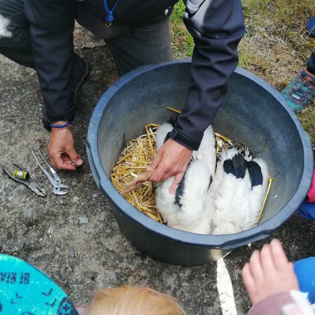 Die Ringe, jeweils ein kleiner aus Metall und ein größerer mit gut erkennbarem Code, wurden vorsichtig um die Beine der Küken befestigt, sodass sie von nun an immer ihren „Personalausweis“ dabei haben und erkannt werden können.