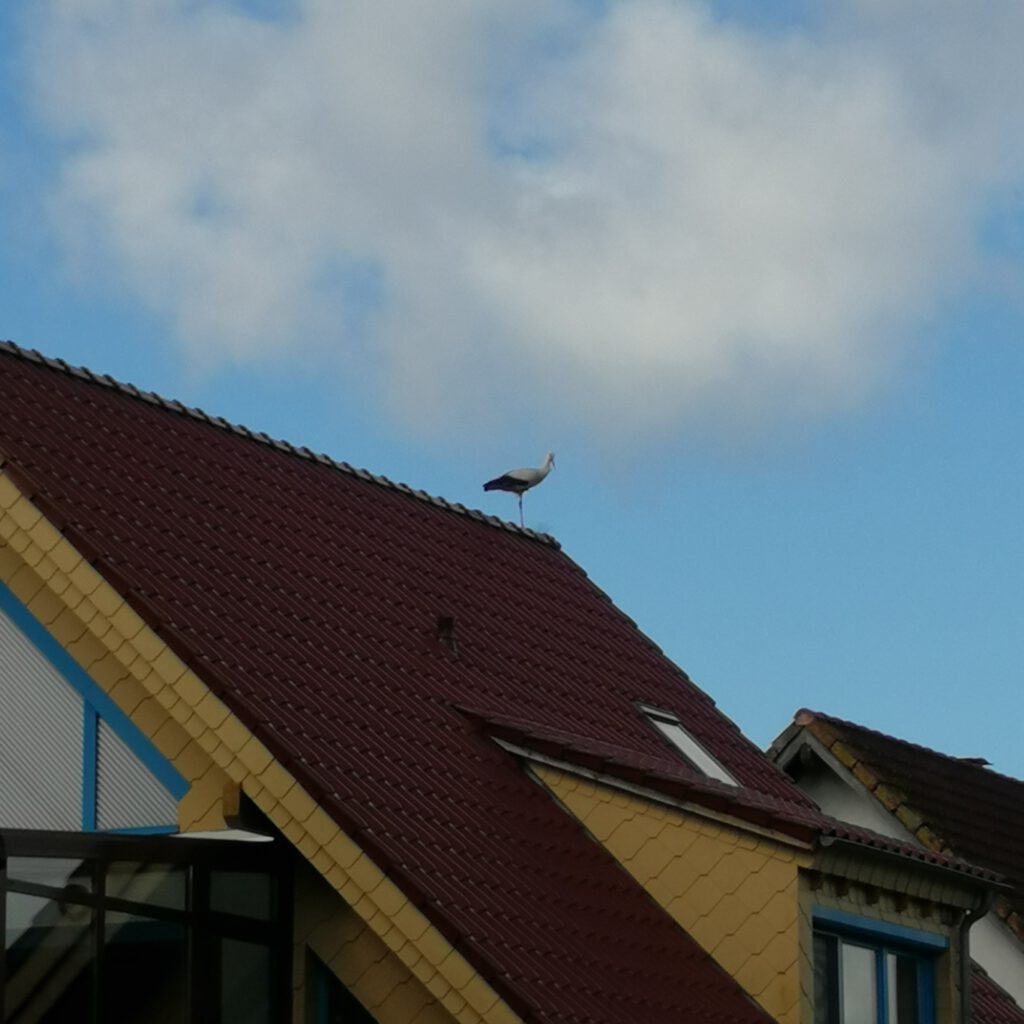 Schon auf dem Weg zum Nest sahen die Kinder den Storchenvater auf einem benachbarten Haus stehen und das Geschehen genauestens beobachten – schließlich kommen nicht alle Tage so viele Besucher so nah an den Horst und seine Familie.